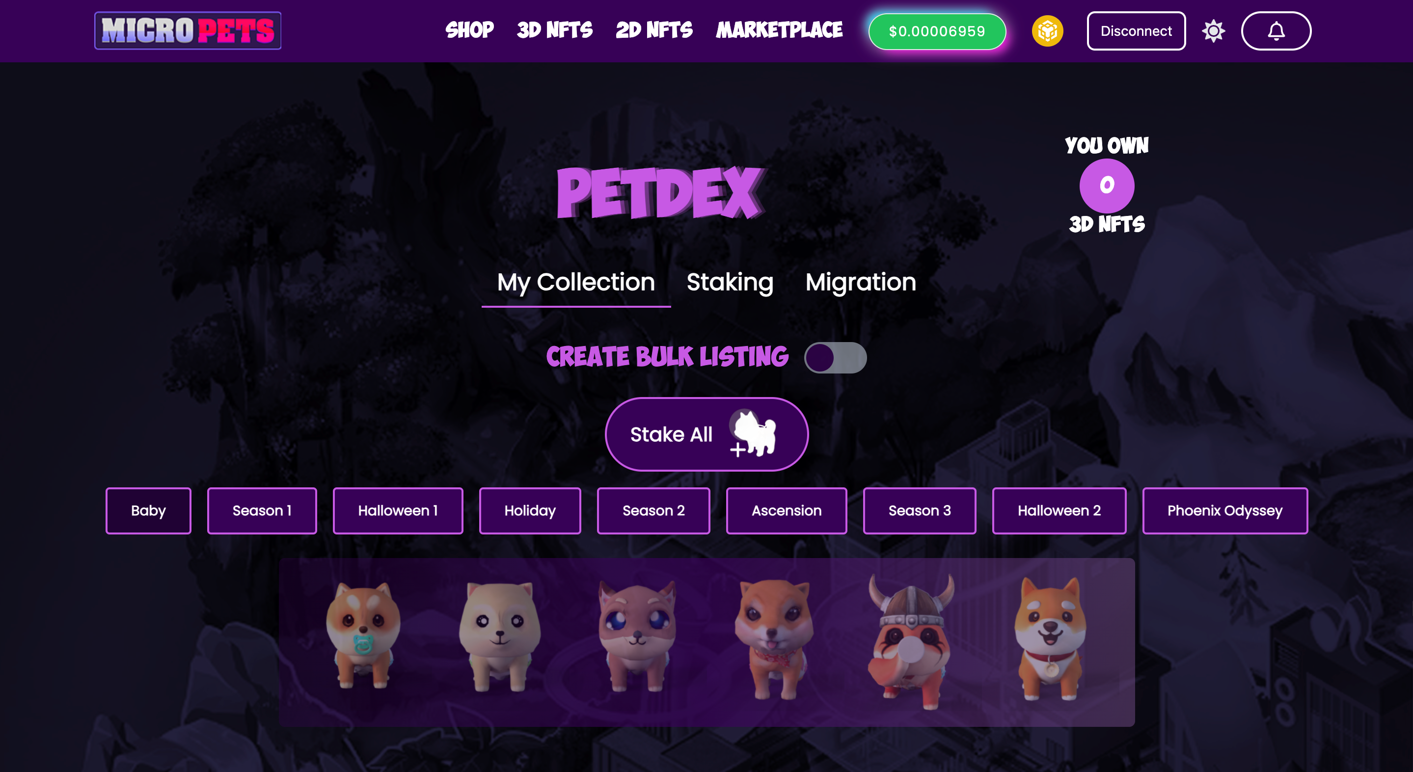 Experience the next level of digital asset interaction with the MicroPets Dapp and Marketplace. Seamlessly integrated with the MicroPets ecosystem, our Dapp offers a user-friendly interface for browsing, purchasing, and trading digital assets. Explore an extensive range of 3D and 2D NFTs, participate in auctions, and engage with the vibrant MicroPets community.